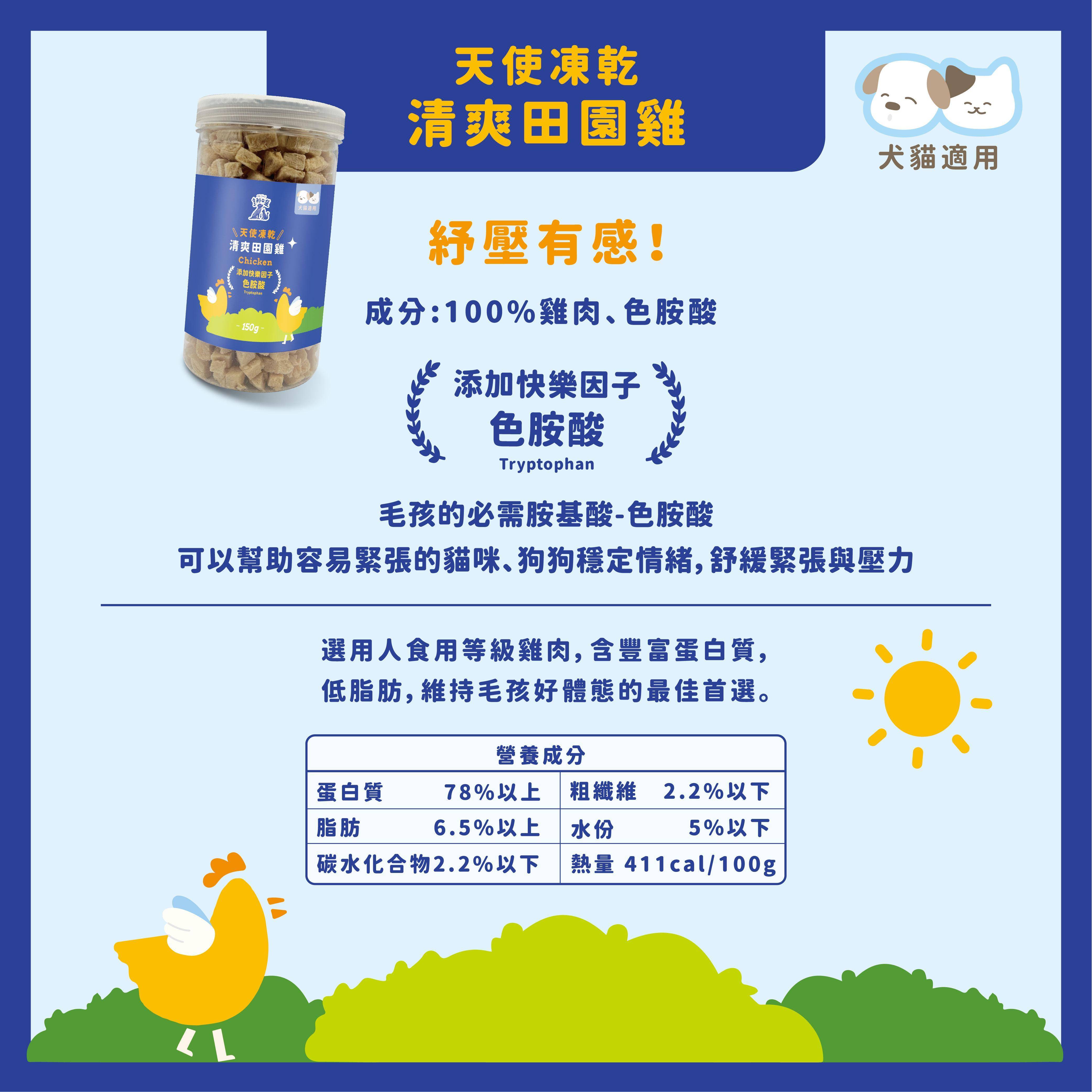 商品詳情 產地:台灣 主要成分:100%雞肉、色胺酸 淨重:150g(±5%) 保存方式:請勿將本產品放置於高溫、潮濕處、避免太陽直射,開封後,請儘速食用完畢有效日期:標示於包裝上(西元年/月/日) 保存期限:2年(未開封) NEW!! 天使凍乾-清爽田園雞150g TWD $499 TWD $499